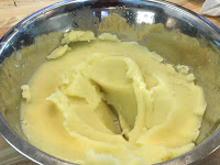 - Pela y quita el germen de los ajos, májalos en el mortero con un poco de sal gorda. Añade a las patatas.